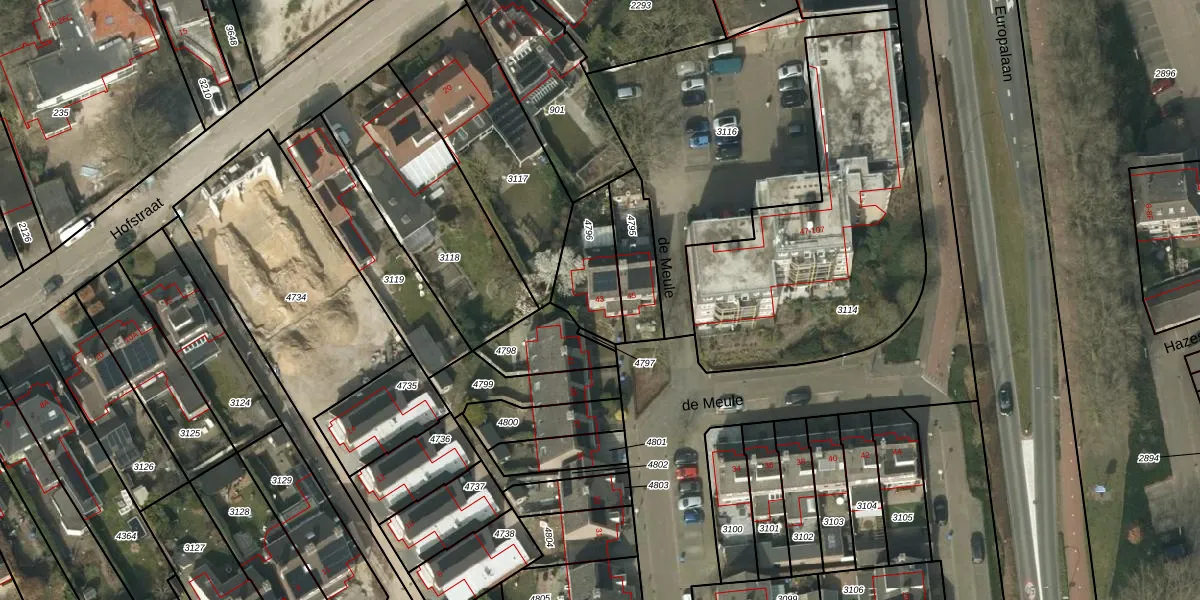 Het perceel waarop de Meule 43 staat heeft een oppervlakte van 209 m². Dit is een middelgroot perceel. De perceeloppervlakte wordt geregistreerd door het Kadaster. Gedetailleerde informatie over de maten van dit perceel kunt u vinden in het rapport Kadastrale kaart met maatvoering van de Meule 43.