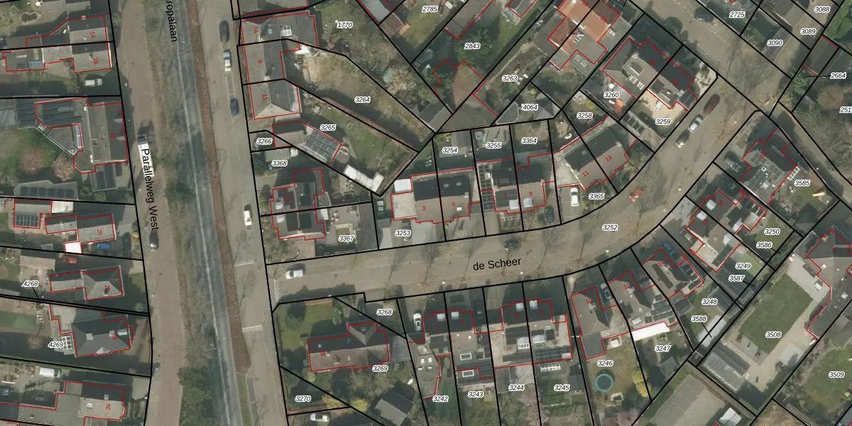 Het perceel waarop de Scheer 3 staat heeft een oppervlakte van 283 m². Dit is een middelgroot perceel. De perceeloppervlakte wordt geregistreerd door het Kadaster. Gedetailleerde informatie over de maten van dit perceel kunt u vinden in het rapport Kadastrale kaart met maatvoering van de Scheer 3.