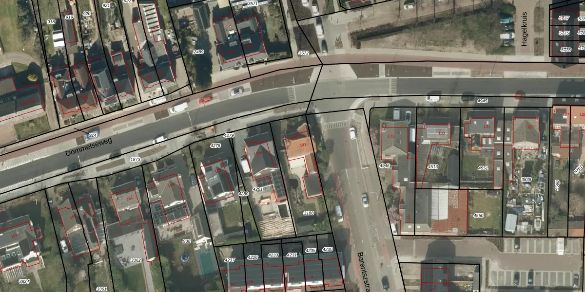 Dommelseweg 141 is gelegen op kadastraal perceel VKW00E3188. Deze kadastrale aanduiding is uniek en wordt gebruikt door het Kadaster om eigendomsrechten en andere zakelijke rechten vast te leggen. Het perceel maakt onderdeel uit van de kadastrale gemeente Valkenswaard.