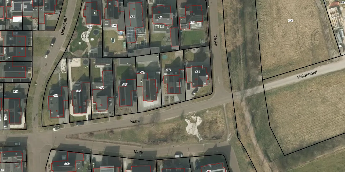 Het perceel waarop Mark 21 staat heeft een oppervlakte van 431 m². Dit is een groot perceel. De perceeloppervlakte wordt geregistreerd door het Kadaster. Gedetailleerde informatie over de maten van dit perceel kunt u vinden in het rapport Kadastrale kaart met maatvoering van Mark 21.