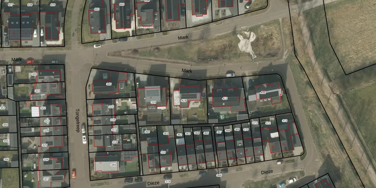 Het perceel waarop Mark 6 staat heeft een oppervlakte van 480 m². Dit is een groot perceel. De perceeloppervlakte wordt geregistreerd door het Kadaster. Gedetailleerde informatie over de maten van dit perceel kunt u vinden in het rapport Kadastrale kaart met maatvoering van Mark 6.