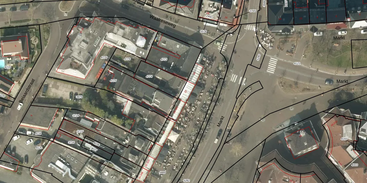 Het perceel waarop Markt 22 staat heeft een oppervlakte van 2693 m². Dit is een zeer groot perceel. De perceeloppervlakte wordt geregistreerd door het Kadaster. Gedetailleerde informatie over de maten van dit perceel kunt u vinden in het rapport Kadastrale kaart met maatvoering van Markt 22.