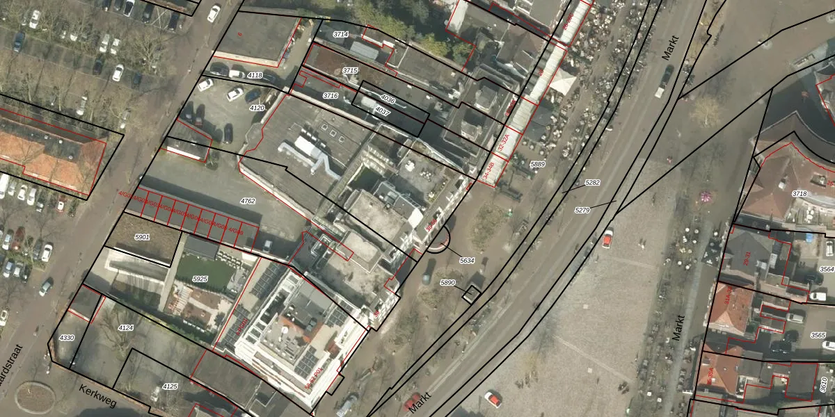 Het perceel waarop Markt 48 staat heeft een oppervlakte van 1347 m². Dit is een zeer groot perceel. De perceeloppervlakte wordt geregistreerd door het Kadaster. Gedetailleerde informatie over de maten van dit perceel kunt u vinden in het rapport Kadastrale kaart met maatvoering van Markt 48.