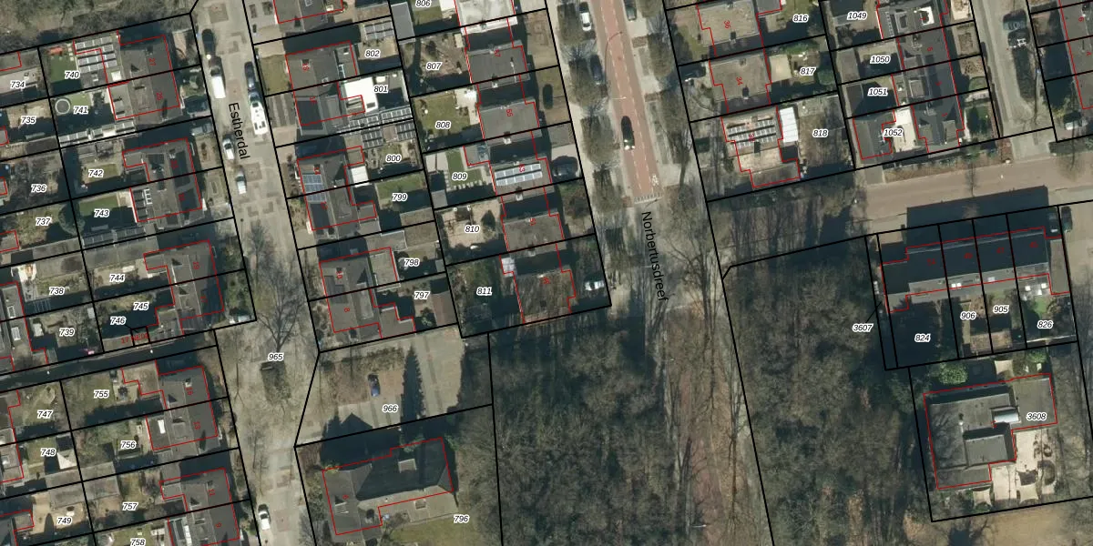 Het perceel waarop Norbertusdreef 49 staat heeft een oppervlakte van 380 m². Dit is een groot perceel. De perceeloppervlakte wordt geregistreerd door het Kadaster. Gedetailleerde informatie over de maten van dit perceel kunt u vinden in het rapport Kadastrale kaart met maatvoering van Norbertusdreef 49.