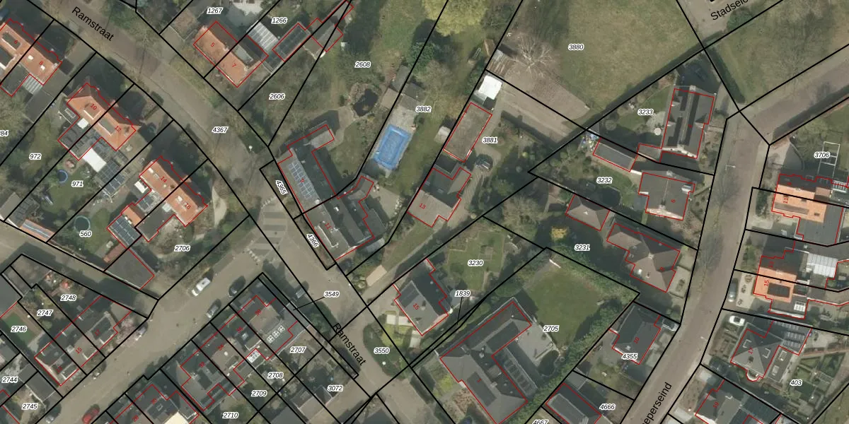 Ramstraat 13 is gelegen op kadastraal perceel VKW00F3881. Deze kadastrale aanduiding is uniek en wordt gebruikt door het Kadaster om eigendomsrechten en andere zakelijke rechten vast te leggen. Het perceel maakt onderdeel uit van de kadastrale gemeente Valkenswaard.