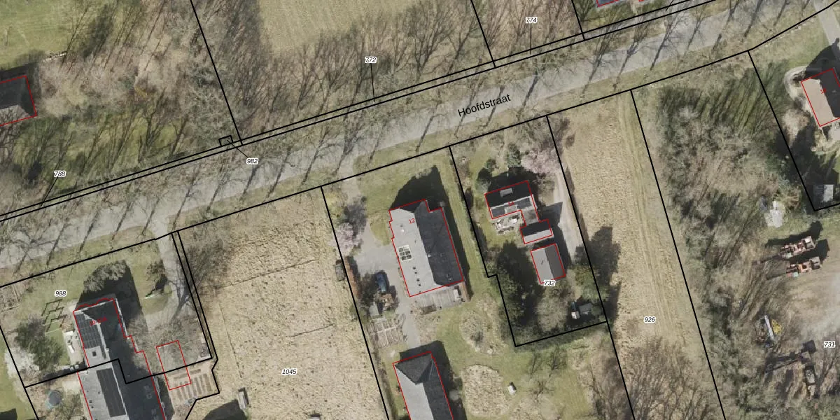 Het perceel waarop Hoofdstraat 12 staat heeft een oppervlakte van 3587 m². Dit is een zeer groot perceel. De perceeloppervlakte wordt geregistreerd door het Kadaster. Gedetailleerde informatie over de maten van dit perceel kunt u vinden in het rapport Kadastrale kaart met maatvoering van Hoofdstraat 12.