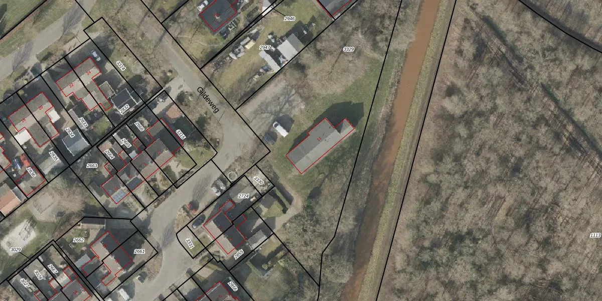 Het perceel waarop Gildeweg 11 staat heeft een oppervlakte van 2656 m². Dit is een zeer groot perceel. De perceeloppervlakte wordt geregistreerd door het Kadaster. Gedetailleerde informatie over de maten van dit perceel kunt u vinden in het rapport Kadastrale kaart met maatvoering van Gildeweg 11.