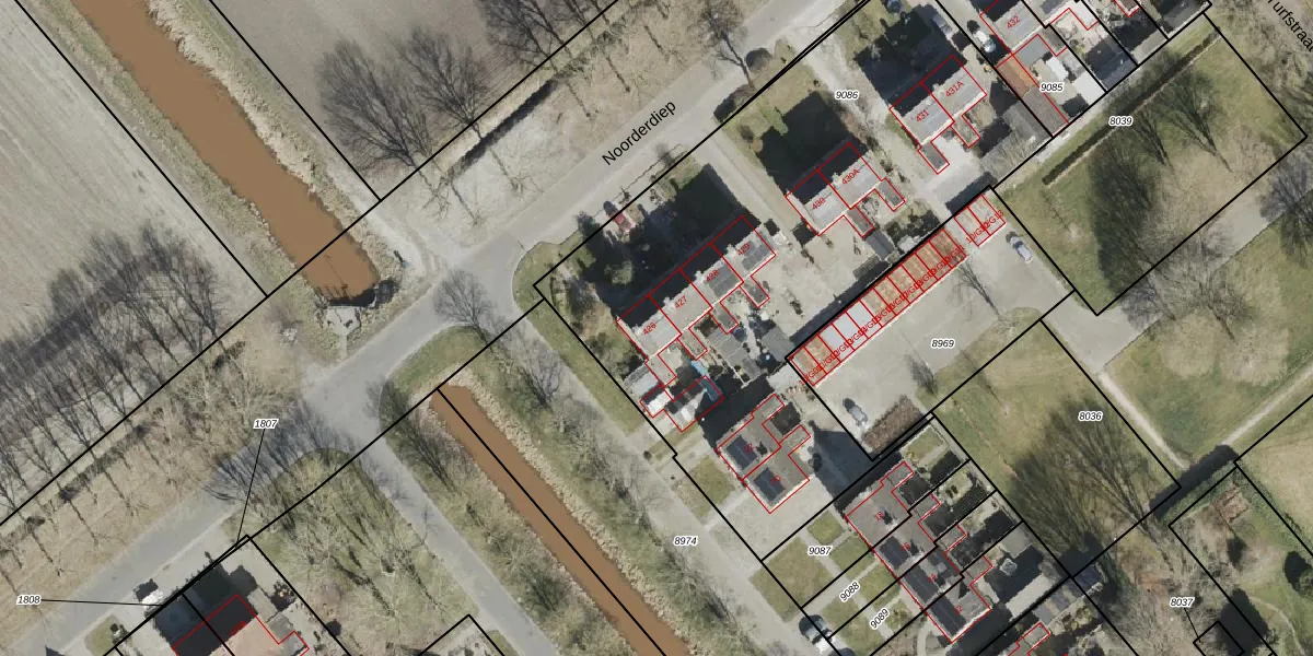 Het perceel waarop Noorderdiep 426 staat heeft een oppervlakte van 3023 m². Dit is een zeer groot perceel. De perceeloppervlakte wordt geregistreerd door het Kadaster. Gedetailleerde informatie over de maten van dit perceel kunt u vinden in het rapport Kadastrale kaart met maatvoering van Noorderdiep 426.