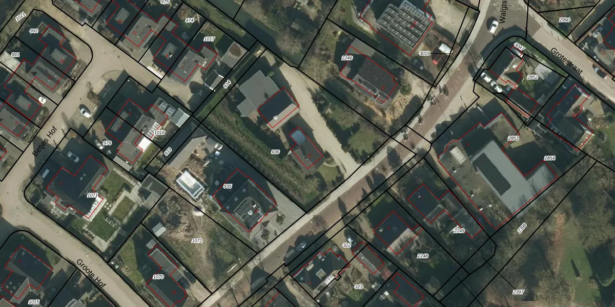 Het perceel waarop Walgtsestraat 12 staat heeft een oppervlakte van 1645 m². Dit is een zeer groot perceel. De perceeloppervlakte wordt geregistreerd door het Kadaster. Gedetailleerde informatie over de maten van dit perceel kunt u vinden in het rapport Kadastrale kaart met maatvoering van Walgtsestraat 12.