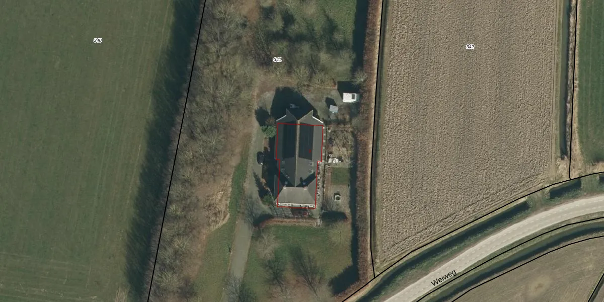 Het perceel waarop Weiweg 9 staat heeft een oppervlakte van 1,1 ha. Dit is een zeer groot perceel. De perceeloppervlakte wordt geregistreerd door het Kadaster. Gedetailleerde informatie over de maten van dit perceel kunt u vinden in het rapport Kadastrale kaart met maatvoering van Weiweg 9.