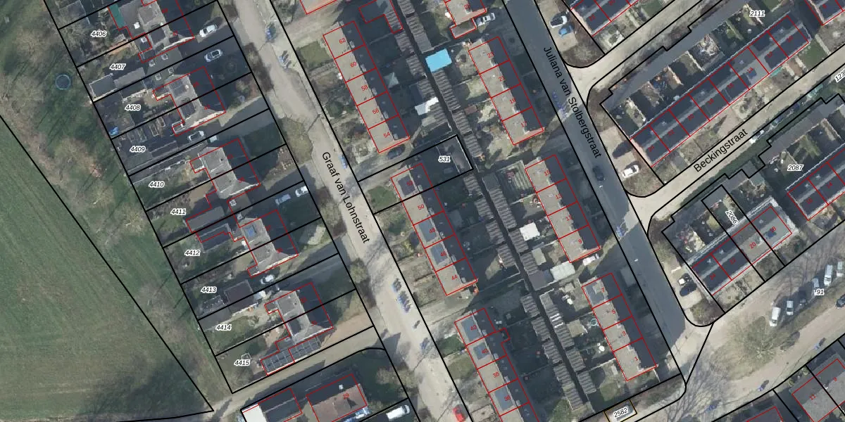 Het perceel waarop Graaf van Lohnstraat 50 staat heeft een oppervlakte van 7325 m². Dit is een zeer groot perceel. De perceeloppervlakte wordt geregistreerd door het Kadaster. Gedetailleerde informatie over de maten van dit perceel kunt u vinden in het rapport Kadastrale kaart met maatvoering van Graaf van Lohnstraat 50.