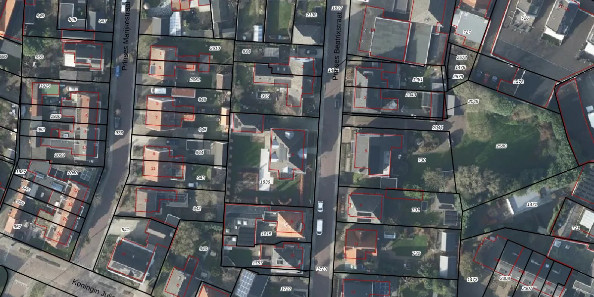 Het perceel waarop Prinses Beatrixstraat 6 staat heeft een oppervlakte van 910 m². Dit is een groot perceel. De perceeloppervlakte wordt geregistreerd door het Kadaster. Gedetailleerde informatie over de maten van dit perceel kunt u vinden in het rapport Kadastrale kaart met maatvoering van Prinses Beatrixstraat 6.