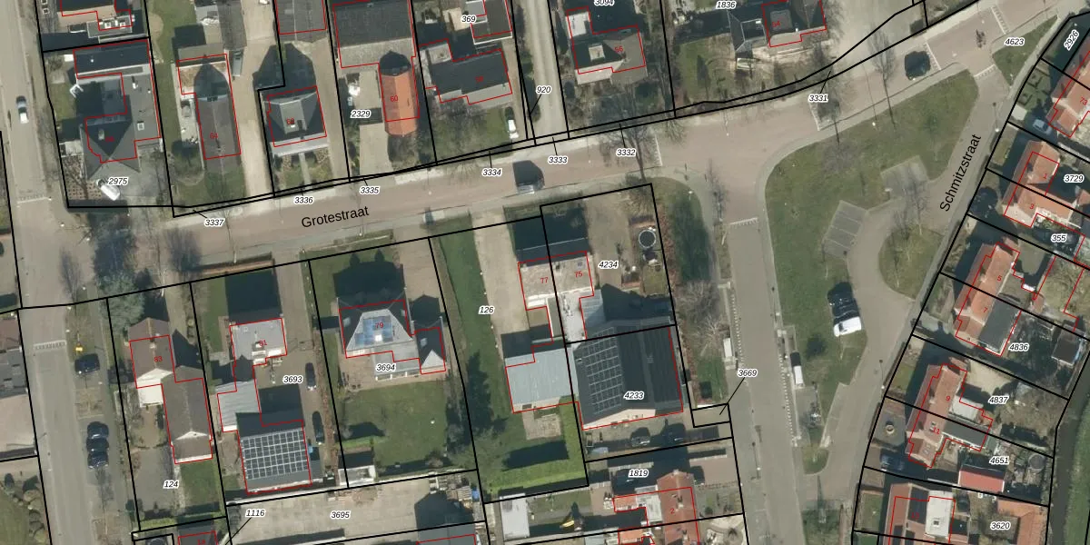 Het perceel waarop Grotestraat 77 staat heeft een oppervlakte van 1007 m². Dit is een zeer groot perceel. De perceeloppervlakte wordt geregistreerd door het Kadaster. Gedetailleerde informatie over de maten van dit perceel kunt u vinden in het rapport Kadastrale kaart met maatvoering van Grotestraat 77.