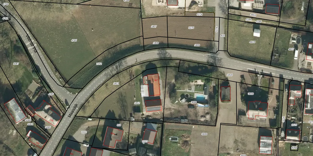 Het perceel waarop Maasdijk 397 staat heeft een oppervlakte van 1080 m². Dit is een zeer groot perceel. De perceeloppervlakte wordt geregistreerd door het Kadaster. Gedetailleerde informatie over de maten van dit perceel kunt u vinden in het rapport Kadastrale kaart met maatvoering van Maasdijk 397.