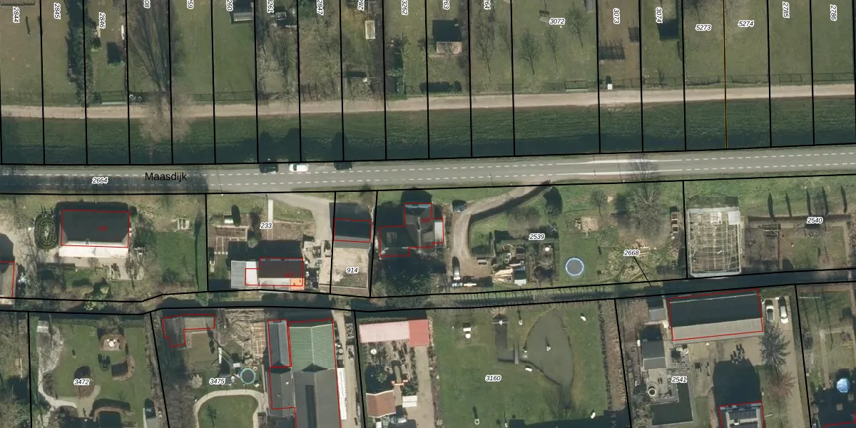 Het perceel waarop Maasdijk 425 staat heeft een oppervlakte van 1775 m². Dit is een zeer groot perceel. De perceeloppervlakte wordt geregistreerd door het Kadaster. Gedetailleerde informatie over de maten van dit perceel kunt u vinden in het rapport Kadastrale kaart met maatvoering van Maasdijk 425.