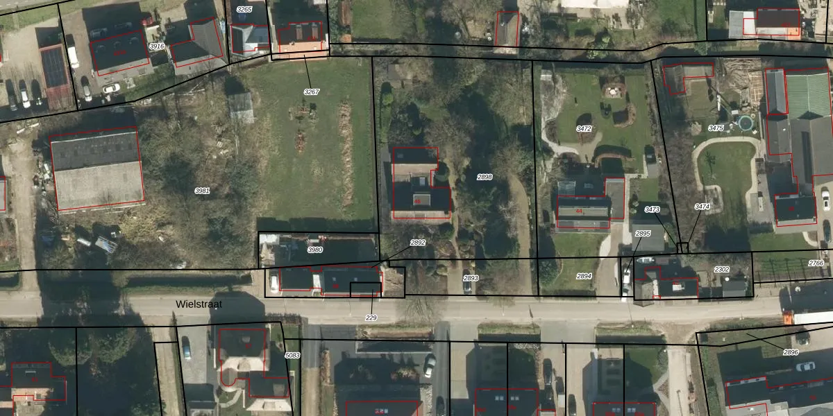 Het perceel waarop Wielstraat 46 staat heeft een oppervlakte van 1880 m². Dit is een zeer groot perceel. De perceeloppervlakte wordt geregistreerd door het Kadaster. Gedetailleerde informatie over de maten van dit perceel kunt u vinden in het rapport Kadastrale kaart met maatvoering van Wielstraat 46.