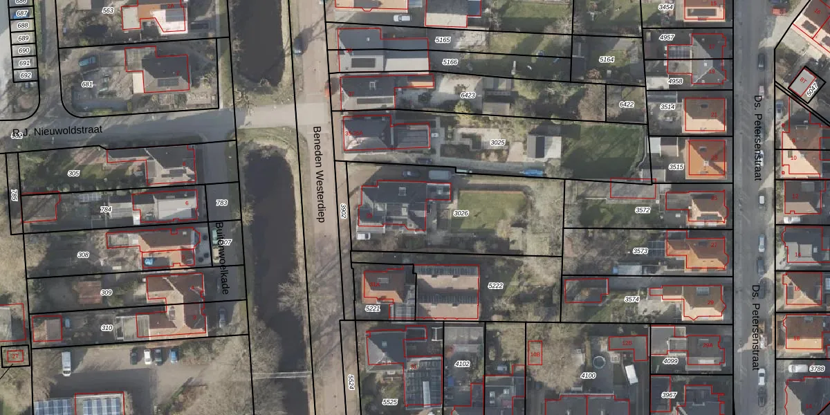 Het perceel waarop Beneden Westerdiep 33 staat heeft een oppervlakte van 1000 m². Dit is een zeer groot perceel. De perceeloppervlakte wordt geregistreerd door het Kadaster. Gedetailleerde informatie over de maten van dit perceel kunt u vinden in het rapport Kadastrale kaart met maatvoering van Beneden Westerdiep 33.