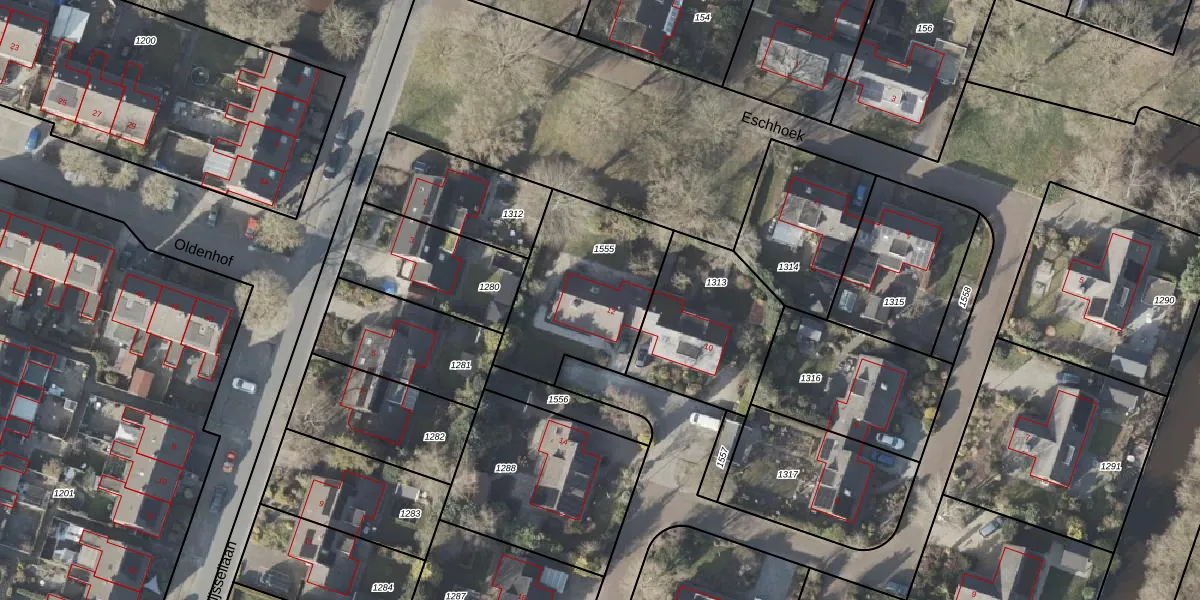 Eschhoek 12 is gelegen op kadastraal perceel WDV02K1555. Deze kadastrale aanduiding is uniek en wordt gebruikt door het Kadaster om eigendomsrechten en andere zakelijke rechten vast te leggen. Het perceel maakt onderdeel uit van de kadastrale gemeente Wildervank.