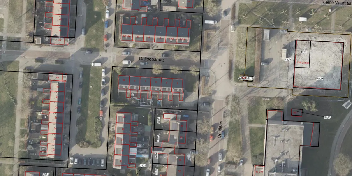 Het perceel waarop Galjootstraat 1 staat heeft een oppervlakte van 2896 m². Dit is een zeer groot perceel. De perceeloppervlakte wordt geregistreerd door het Kadaster. Gedetailleerde informatie over de maten van dit perceel kunt u vinden in het rapport Kadastrale kaart met maatvoering van Galjootstraat 1.