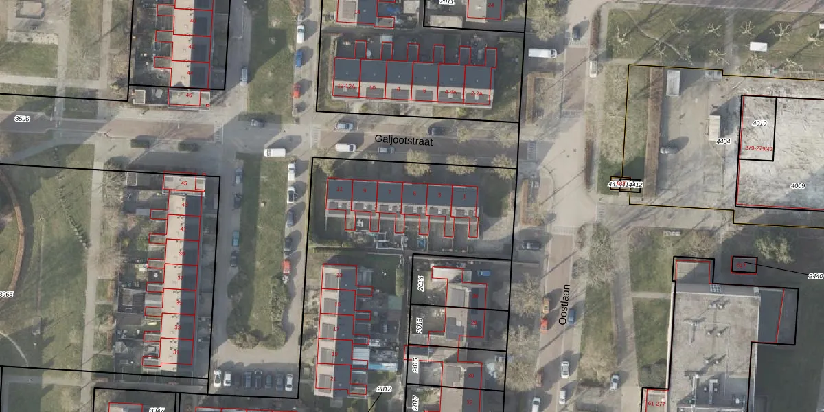 Het perceel waarop Galjootstraat 5 staat heeft een oppervlakte van 2896 m². Dit is een zeer groot perceel. De perceeloppervlakte wordt geregistreerd door het Kadaster. Gedetailleerde informatie over de maten van dit perceel kunt u vinden in het rapport Kadastrale kaart met maatvoering van Galjootstraat 5.