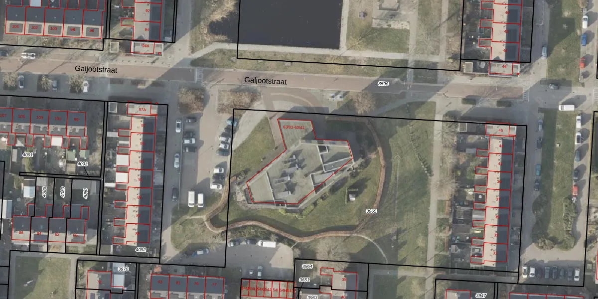 Het perceel waarop Galjootstraat 63-32 staat heeft een oppervlakte van 5804 m². Dit is een zeer groot perceel. De perceeloppervlakte wordt geregistreerd door het Kadaster. Gedetailleerde informatie over de maten van dit perceel kunt u vinden in het rapport Kadastrale kaart met maatvoering van Galjootstraat 63-32.