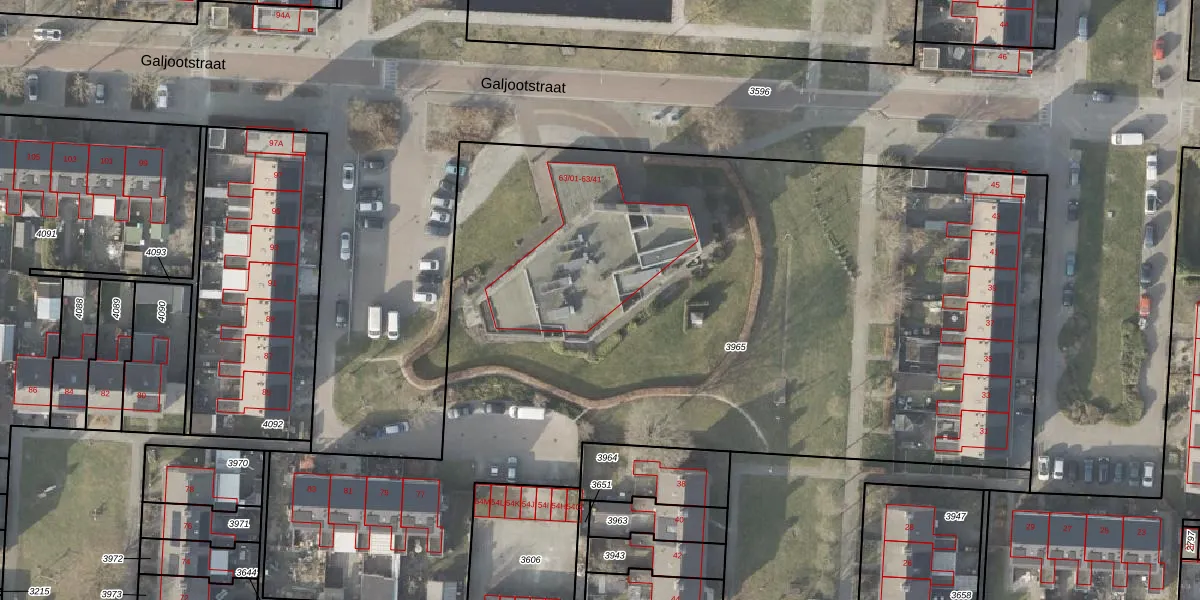 Het perceel waarop Galjootstraat 63-33 staat heeft een oppervlakte van 5804 m². Dit is een zeer groot perceel. De perceeloppervlakte wordt geregistreerd door het Kadaster. Gedetailleerde informatie over de maten van dit perceel kunt u vinden in het rapport Kadastrale kaart met maatvoering van Galjootstraat 63-33.