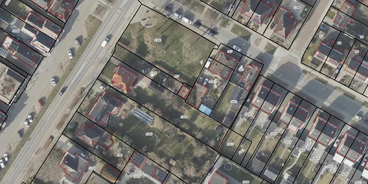 Het perceel waarop Havenstraat 13-T staat heeft een oppervlakte van 44 m². Dit is een klein perceel. De perceeloppervlakte wordt geregistreerd door het Kadaster. Gedetailleerde informatie over de maten van dit perceel kunt u vinden in het rapport Kadastrale kaart met maatvoering van Havenstraat 13-T.