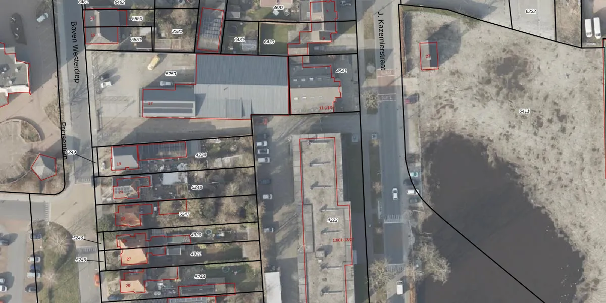 Het perceel waarop J. Kazemierstraat 13-21 staat heeft een oppervlakte van 2475 m². Dit is een zeer groot perceel. De perceeloppervlakte wordt geregistreerd door het Kadaster. Gedetailleerde informatie over de maten van dit perceel kunt u vinden in het rapport Kadastrale kaart met maatvoering van J. Kazemierstraat 13-21.