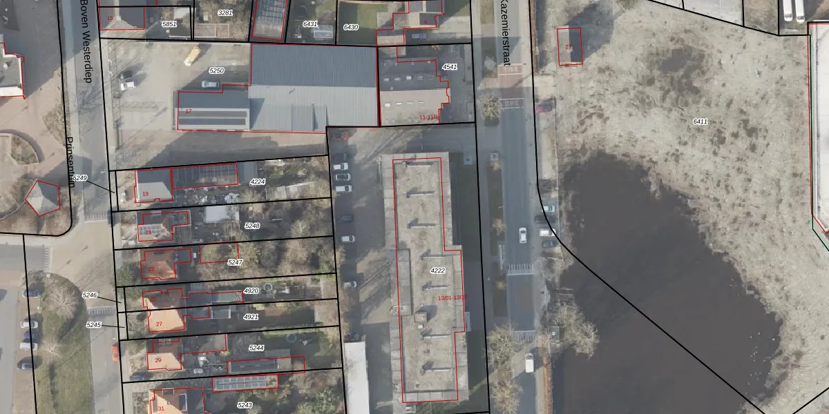 Het perceel waarop J. Kazemierstraat 13-12 staat heeft een oppervlakte van 2475 m². Dit is een zeer groot perceel. De perceeloppervlakte wordt geregistreerd door het Kadaster. Gedetailleerde informatie over de maten van dit perceel kunt u vinden in het rapport Kadastrale kaart met maatvoering van J. Kazemierstraat 13-12.