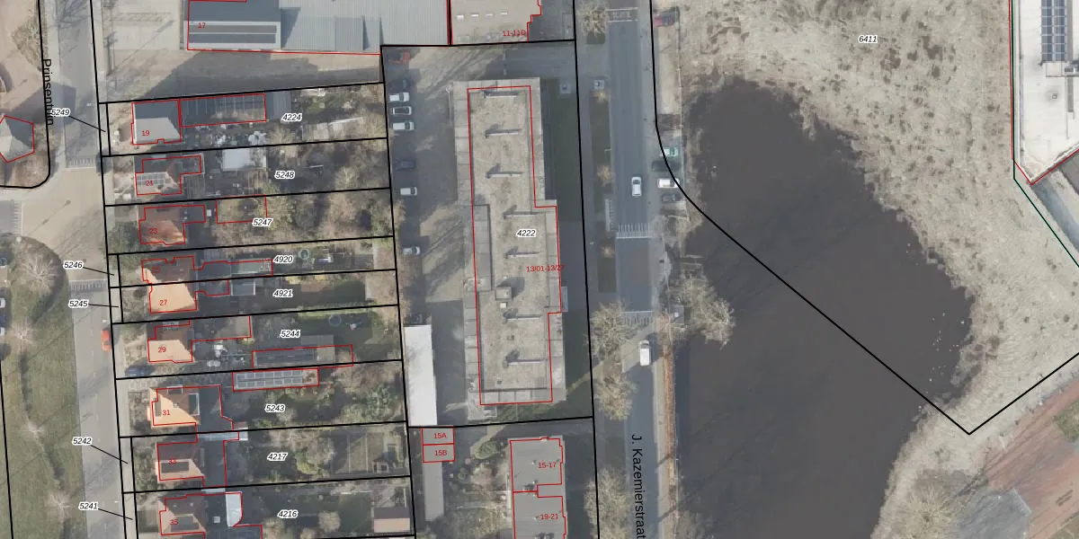 Het perceel waarop J. Kazemierstraat 13-15 staat heeft een oppervlakte van 2475 m². Dit is een zeer groot perceel. De perceeloppervlakte wordt geregistreerd door het Kadaster. Gedetailleerde informatie over de maten van dit perceel kunt u vinden in het rapport Kadastrale kaart met maatvoering van J. Kazemierstraat 13-15.