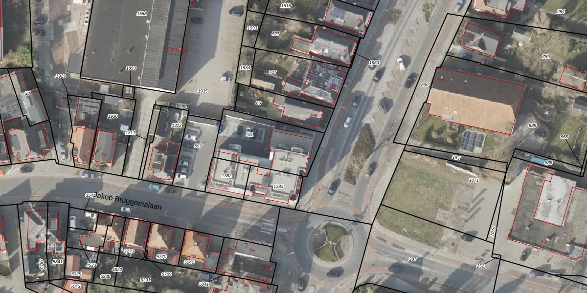 Het perceel waarop Jakob Bruggemalaan 2-15 staat heeft een oppervlakte van 570 m². Dit is een groot perceel. De perceeloppervlakte wordt geregistreerd door het Kadaster. Gedetailleerde informatie over de maten van dit perceel kunt u vinden in het rapport Kadastrale kaart met maatvoering van Jakob Bruggemalaan 2-15.