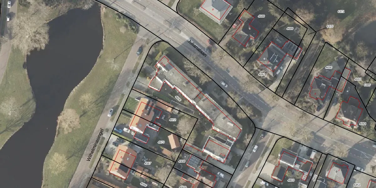 Het perceel waarop Julianalaan 12 staat heeft een oppervlakte van 2030 m². Dit is een zeer groot perceel. De perceeloppervlakte wordt geregistreerd door het Kadaster. Gedetailleerde informatie over de maten van dit perceel kunt u vinden in het rapport Kadastrale kaart met maatvoering van Julianalaan 12.