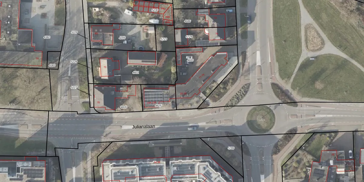 Het perceel waarop Julianalaan 23-A staat heeft een oppervlakte van 889 m². Dit is een groot perceel. De perceeloppervlakte wordt geregistreerd door het Kadaster. Gedetailleerde informatie over de maten van dit perceel kunt u vinden in het rapport Kadastrale kaart met maatvoering van Julianalaan 23-A.