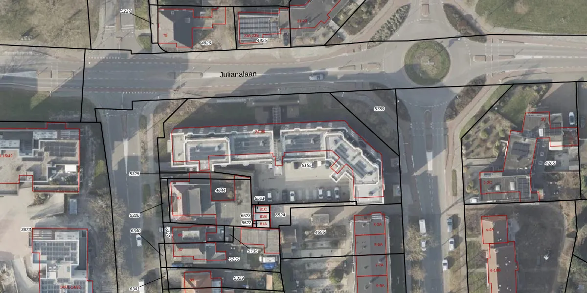Het perceel waarop Julianalaan 34 staat heeft een oppervlakte van 2415 m². Dit is een zeer groot perceel. De perceeloppervlakte wordt geregistreerd door het Kadaster. Gedetailleerde informatie over de maten van dit perceel kunt u vinden in het rapport Kadastrale kaart met maatvoering van Julianalaan 34.