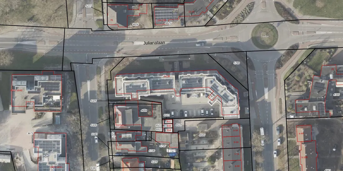 Het perceel waarop Julianalaan 36 staat heeft een oppervlakte van 2415 m². Dit is een zeer groot perceel. De perceeloppervlakte wordt geregistreerd door het Kadaster. Gedetailleerde informatie over de maten van dit perceel kunt u vinden in het rapport Kadastrale kaart met maatvoering van Julianalaan 36.