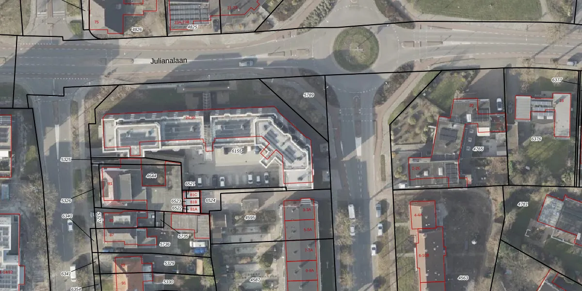 Het perceel waarop Julianalaan 48 staat heeft een oppervlakte van 2415 m². Dit is een zeer groot perceel. De perceeloppervlakte wordt geregistreerd door het Kadaster. Gedetailleerde informatie over de maten van dit perceel kunt u vinden in het rapport Kadastrale kaart met maatvoering van Julianalaan 48.