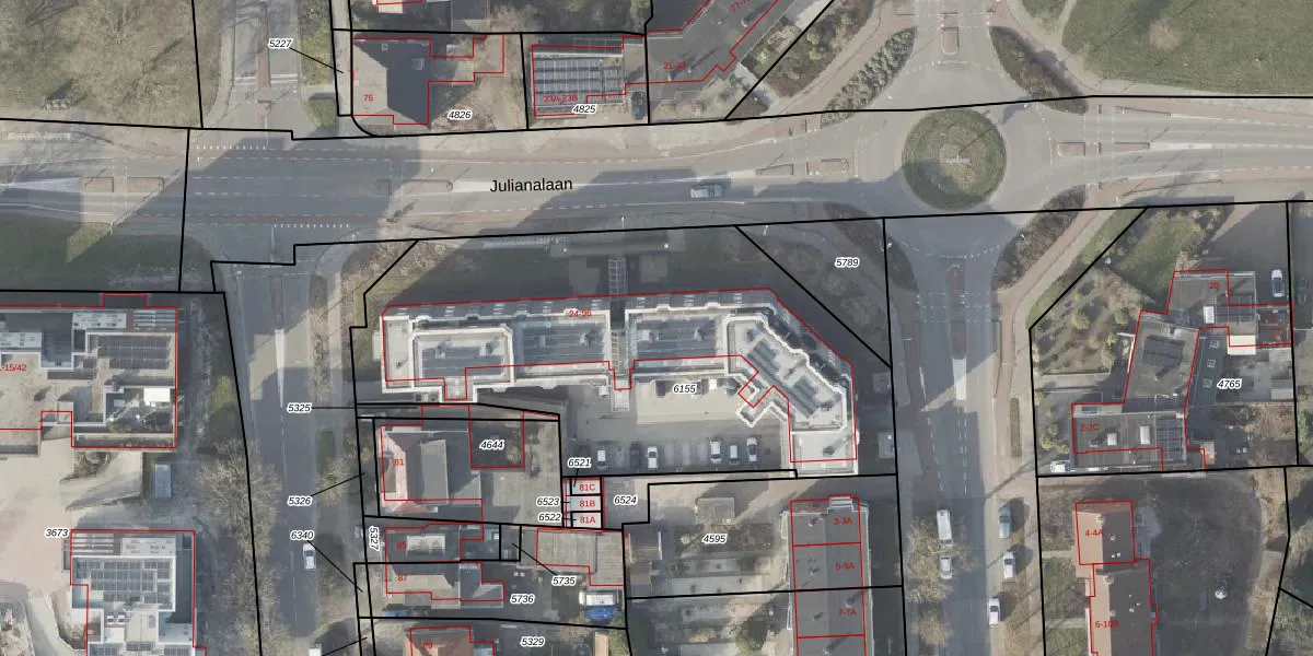 Het perceel waarop Julianalaan 56 staat heeft een oppervlakte van 2415 m². Dit is een zeer groot perceel. De perceeloppervlakte wordt geregistreerd door het Kadaster. Gedetailleerde informatie over de maten van dit perceel kunt u vinden in het rapport Kadastrale kaart met maatvoering van Julianalaan 56.
