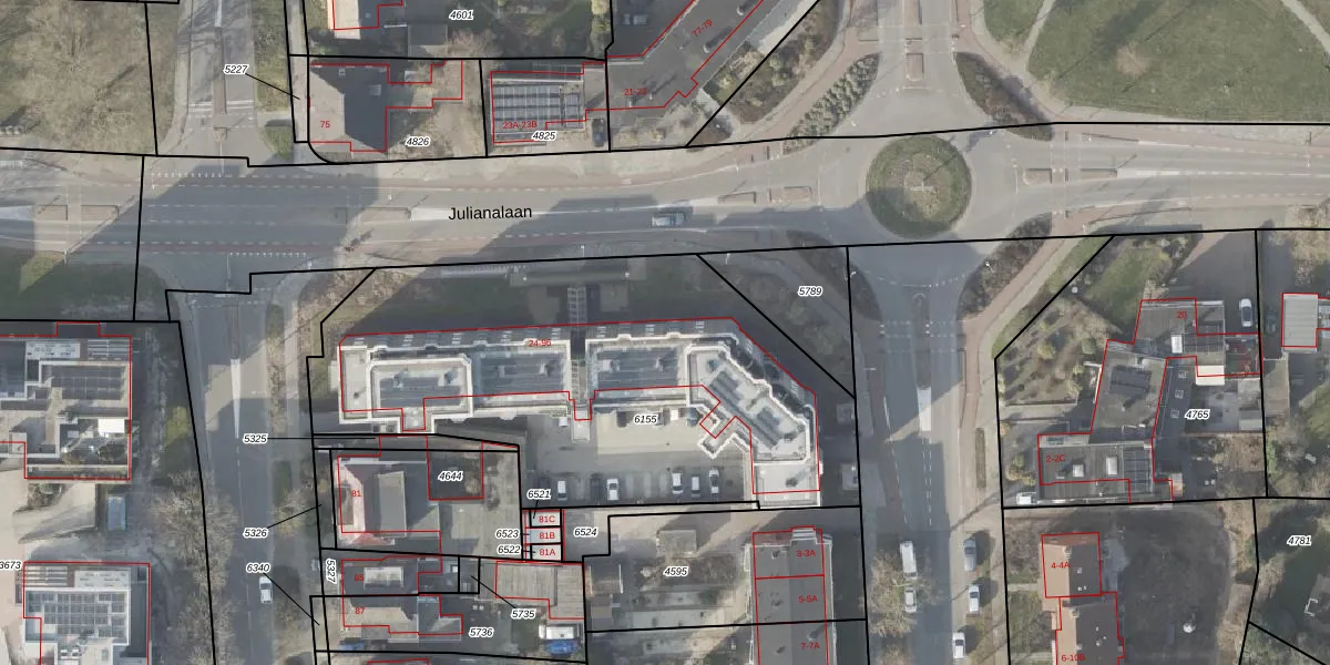 Het perceel waarop Julianalaan 76 staat heeft een oppervlakte van 2415 m². Dit is een zeer groot perceel. De perceeloppervlakte wordt geregistreerd door het Kadaster. Gedetailleerde informatie over de maten van dit perceel kunt u vinden in het rapport Kadastrale kaart met maatvoering van Julianalaan 76.