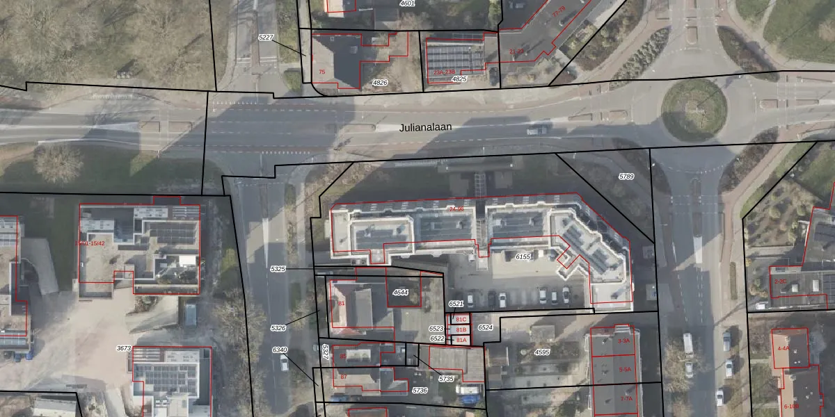 Het perceel waarop Julianalaan 84 staat heeft een oppervlakte van 2415 m². Dit is een zeer groot perceel. De perceeloppervlakte wordt geregistreerd door het Kadaster. Gedetailleerde informatie over de maten van dit perceel kunt u vinden in het rapport Kadastrale kaart met maatvoering van Julianalaan 84.