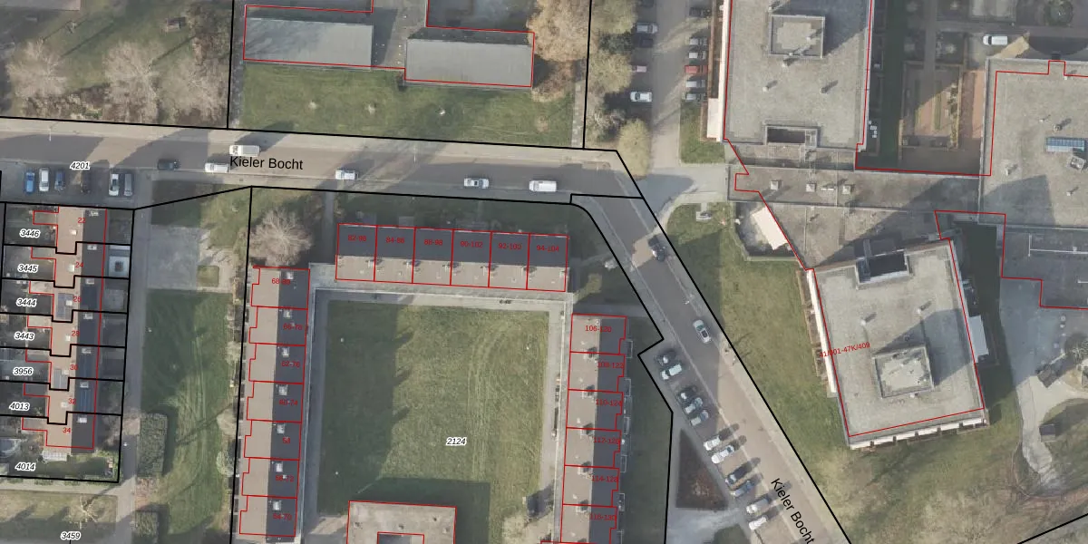 Kieler Bocht 104 is gelegen op kadastraal perceel VDM00C2124. Deze kadastrale aanduiding is uniek en wordt gebruikt door het Kadaster om eigendomsrechten en andere zakelijke rechten vast te leggen. Het perceel maakt onderdeel uit van de kadastrale gemeente Veendam.