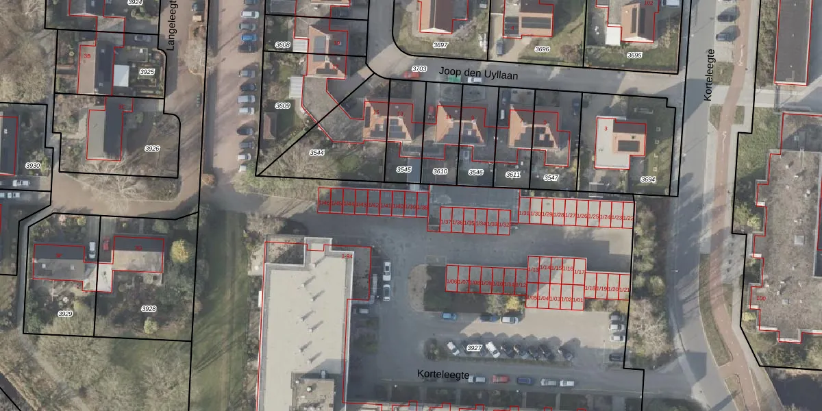 Het perceel waarop Korteleegte 1-39 staat heeft een oppervlakte van 1,0 ha. Dit is een zeer groot perceel. De perceeloppervlakte wordt geregistreerd door het Kadaster. Gedetailleerde informatie over de maten van dit perceel kunt u vinden in het rapport Kadastrale kaart met maatvoering van Korteleegte 1-39.