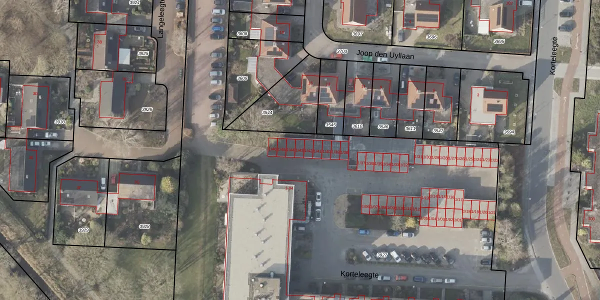 Het perceel waarop Korteleegte 1-43 staat heeft een oppervlakte van 1,0 ha. Dit is een zeer groot perceel. De perceeloppervlakte wordt geregistreerd door het Kadaster. Gedetailleerde informatie over de maten van dit perceel kunt u vinden in het rapport Kadastrale kaart met maatvoering van Korteleegte 1-43.