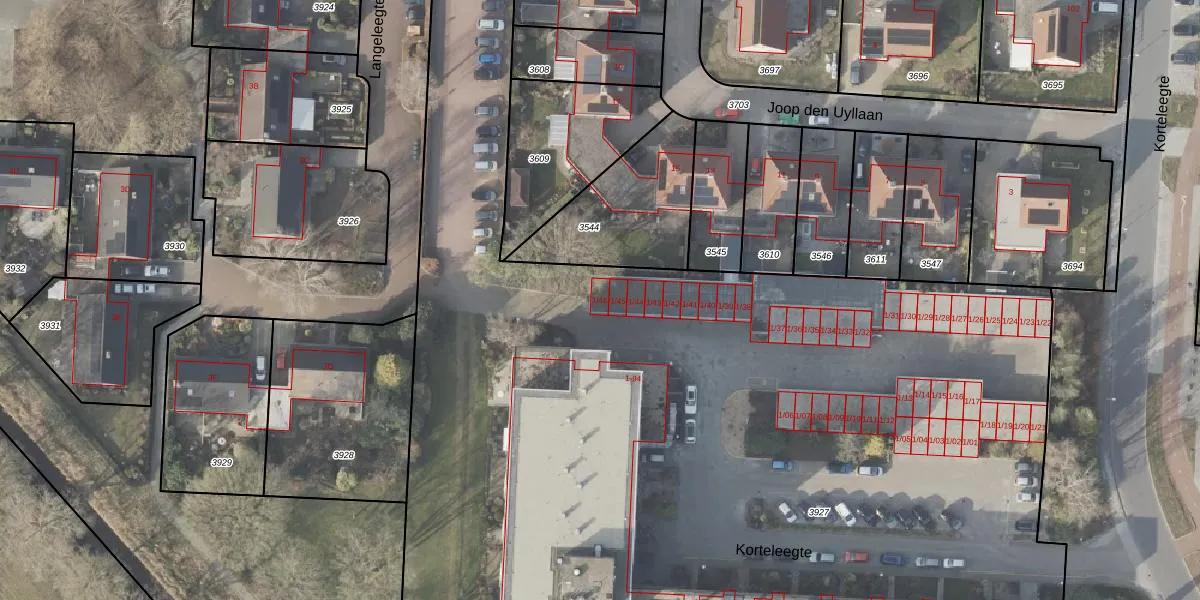 Het perceel waarop Korteleegte 1-46 staat heeft een oppervlakte van 1,0 ha. Dit is een zeer groot perceel. De perceeloppervlakte wordt geregistreerd door het Kadaster. Gedetailleerde informatie over de maten van dit perceel kunt u vinden in het rapport Kadastrale kaart met maatvoering van Korteleegte 1-46.