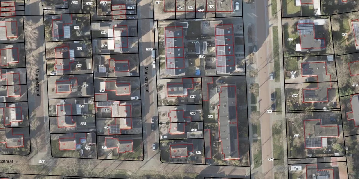 Het perceel waarop Marijkestraat 13 staat heeft een oppervlakte van 375 m². Dit is een groot perceel. De perceeloppervlakte wordt geregistreerd door het Kadaster. Gedetailleerde informatie over de maten van dit perceel kunt u vinden in het rapport Kadastrale kaart met maatvoering van Marijkestraat 13.