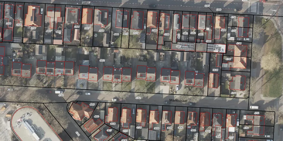 Het perceel waarop Marktstraat 24 staat heeft een oppervlakte van 4905 m². Dit is een zeer groot perceel. De perceeloppervlakte wordt geregistreerd door het Kadaster. Gedetailleerde informatie over de maten van dit perceel kunt u vinden in het rapport Kadastrale kaart met maatvoering van Marktstraat 24.