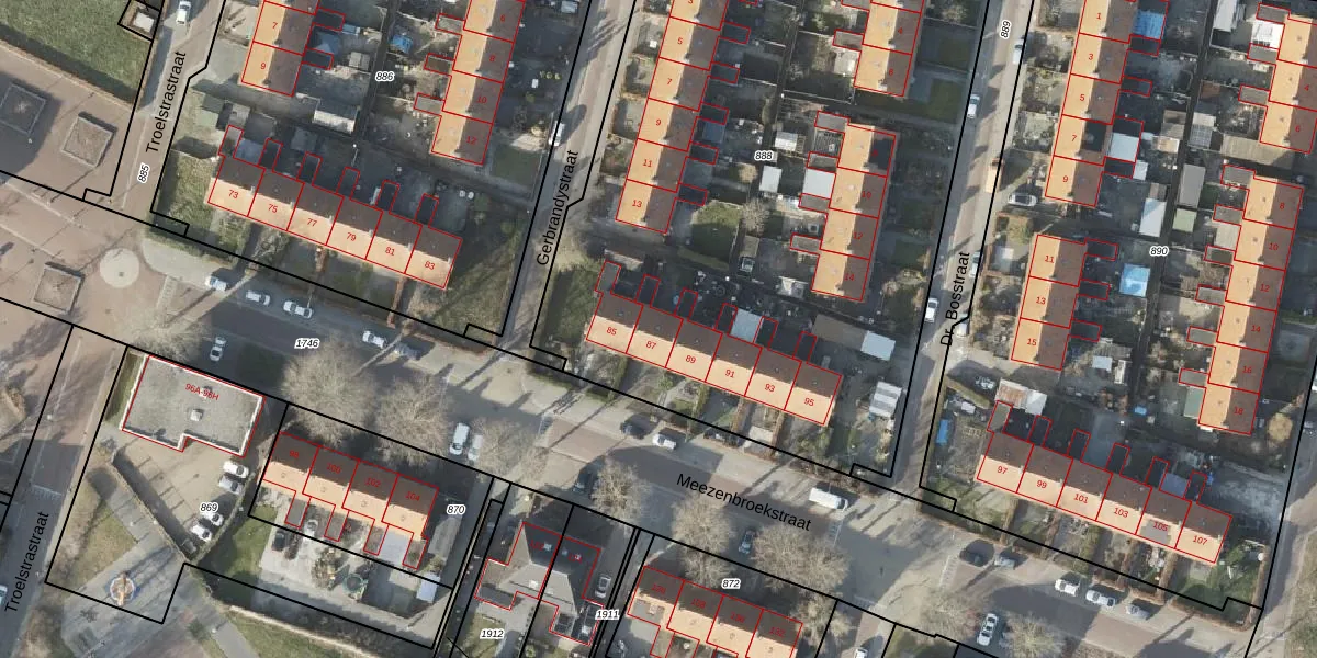 Het perceel waarop Meezenbroekstraat 87 staat heeft een oppervlakte van 4150 m². Dit is een zeer groot perceel. De perceeloppervlakte wordt geregistreerd door het Kadaster. Gedetailleerde informatie over de maten van dit perceel kunt u vinden in het rapport Kadastrale kaart met maatvoering van Meezenbroekstraat 87.