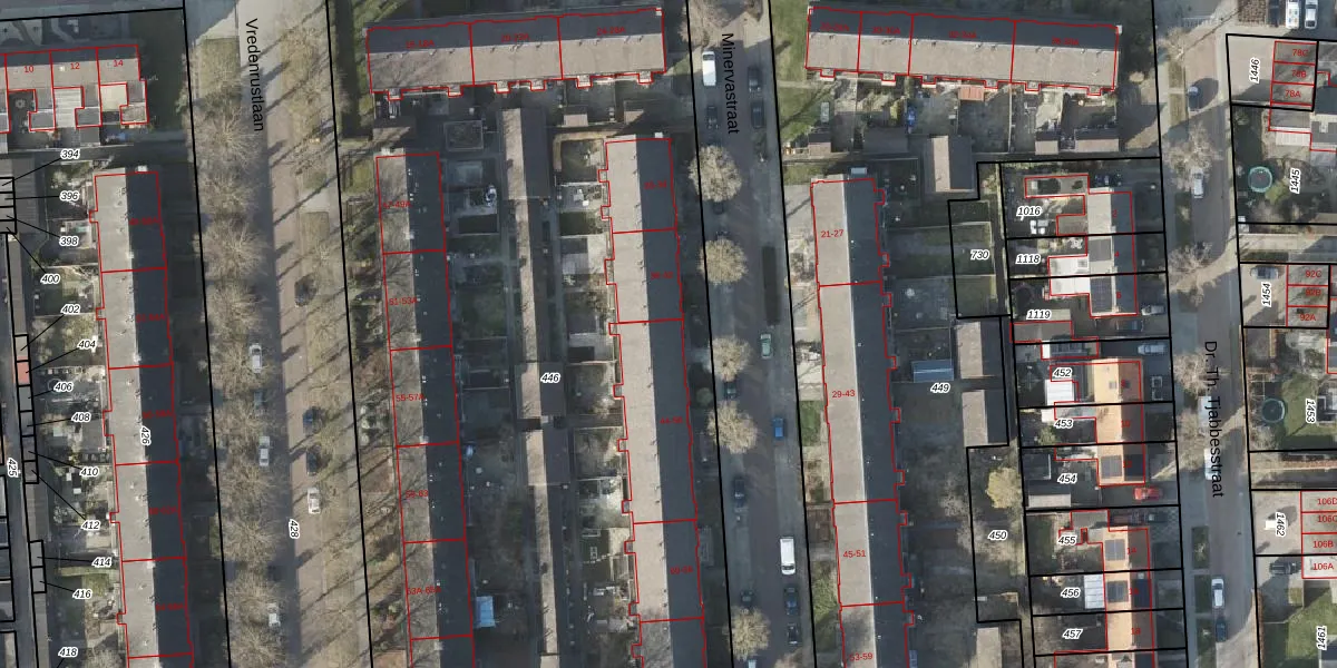 Minervastraat 44 is gelegen op kadastraal perceel VDM00L446. Deze kadastrale aanduiding is uniek en wordt gebruikt door het Kadaster om eigendomsrechten en andere zakelijke rechten vast te leggen. Het perceel maakt onderdeel uit van de kadastrale gemeente Veendam.