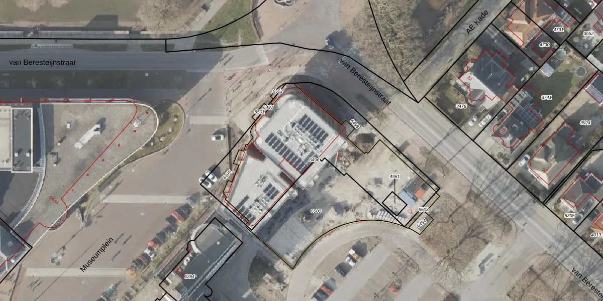 Het perceel waarop Museumplein 34-18 staat heeft een oppervlakte van 1388 m². Dit is een zeer groot perceel. De perceeloppervlakte wordt geregistreerd door het Kadaster. Gedetailleerde informatie over de maten van dit perceel kunt u vinden in het rapport Kadastrale kaart met maatvoering van Museumplein 34-18.