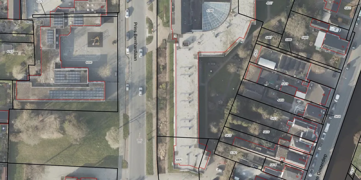 Het perceel waarop Prins Bernhardlaan 56-004 staat heeft een oppervlakte van 5369 m². Dit is een zeer groot perceel. De perceeloppervlakte wordt geregistreerd door het Kadaster. Gedetailleerde informatie over de maten van dit perceel kunt u vinden in het rapport Kadastrale kaart met maatvoering van Prins Bernhardlaan 56-004.