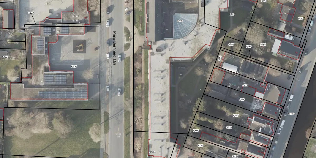 Het perceel waarop Prins Bernhardlaan 56-103 staat heeft een oppervlakte van 5369 m². Dit is een zeer groot perceel. De perceeloppervlakte wordt geregistreerd door het Kadaster. Gedetailleerde informatie over de maten van dit perceel kunt u vinden in het rapport Kadastrale kaart met maatvoering van Prins Bernhardlaan 56-103.